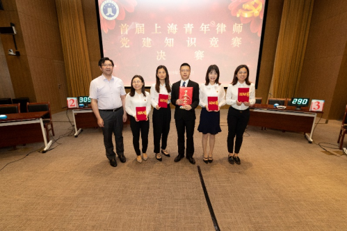 上海市律师行业党委副书记、上海市司法局律师工作处副处长忻峰为获得一等奖的长宁区新长征队颁奖。
