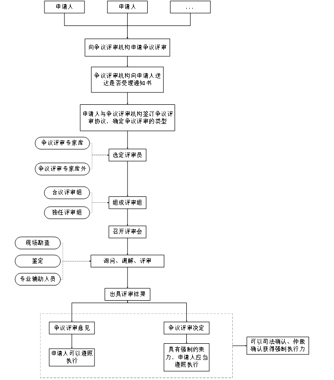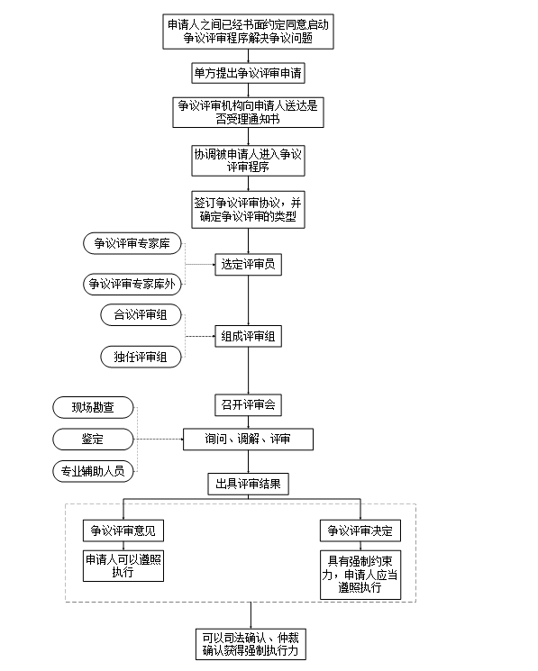 争议事项发生时,申请人应当向争议评审机构提起申请。评审机构决定受理的,申请人收到受理通知书之日起即作为争议评审案件的当事人参与争议评审程序并与评审机构签订评审协议。协议签订后由当事人选定评审员并确定评审组,评审组将召开评审会议出具争议评审结果。争议评审结果送达至当事人后,即按照评审协议的约定产生相应效力。